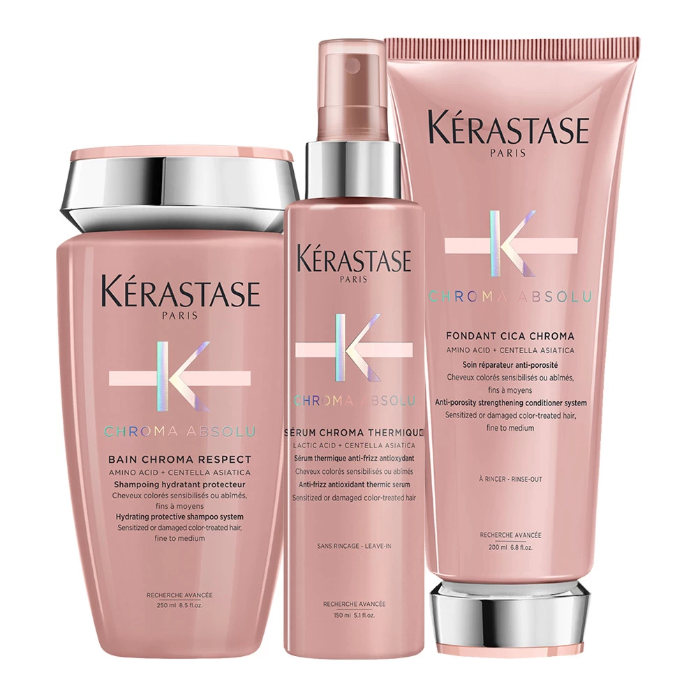 Pack Chroma Respect Chroma Absolu Kérastase composé d’un Bain Chroma Respect 250ml, d’un Fondant Cica Chroma 200ml et d’un Sérum Chroma Thermique 150ml, pour les cheveux colorés sensibilisés ou abîmés, fins à moyens.